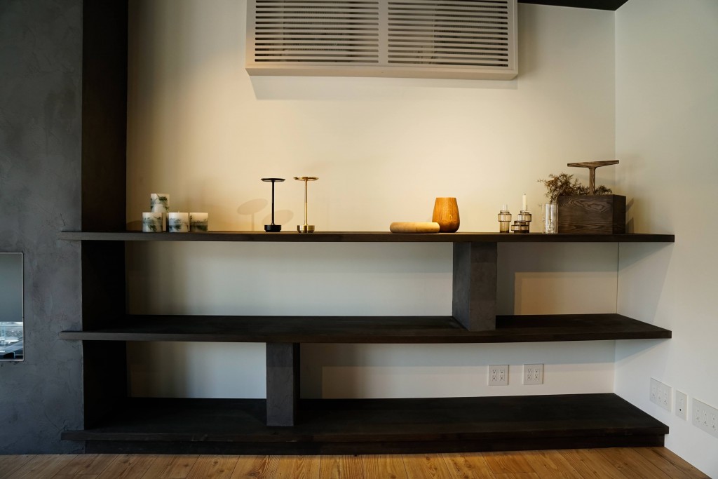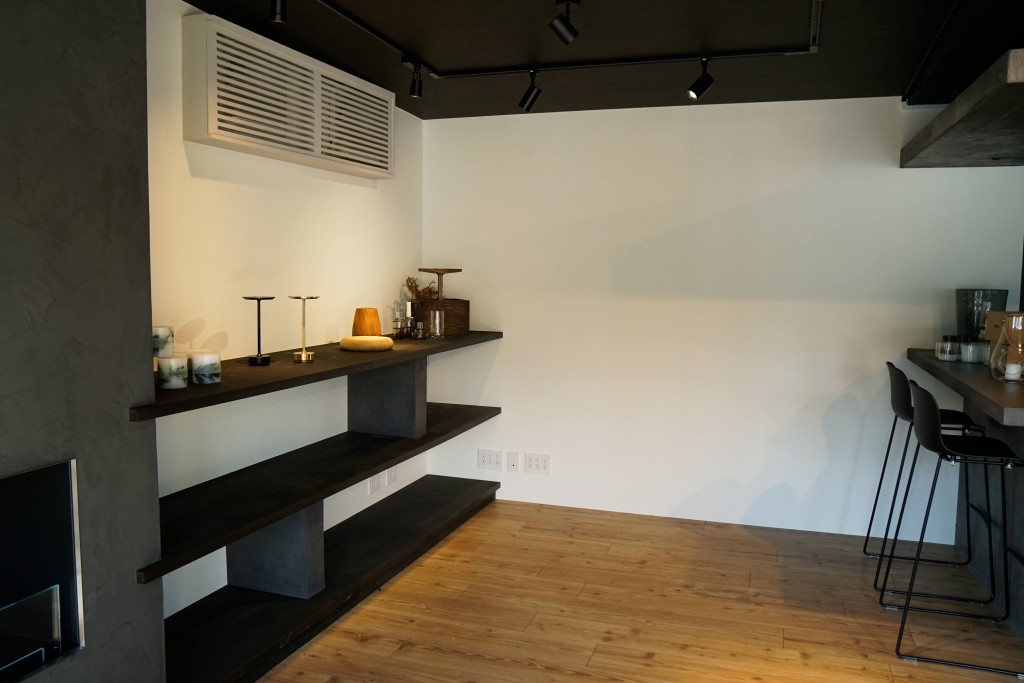 棚の隣にはエコスマートファイヤーの炎が灯り上質な空間です。