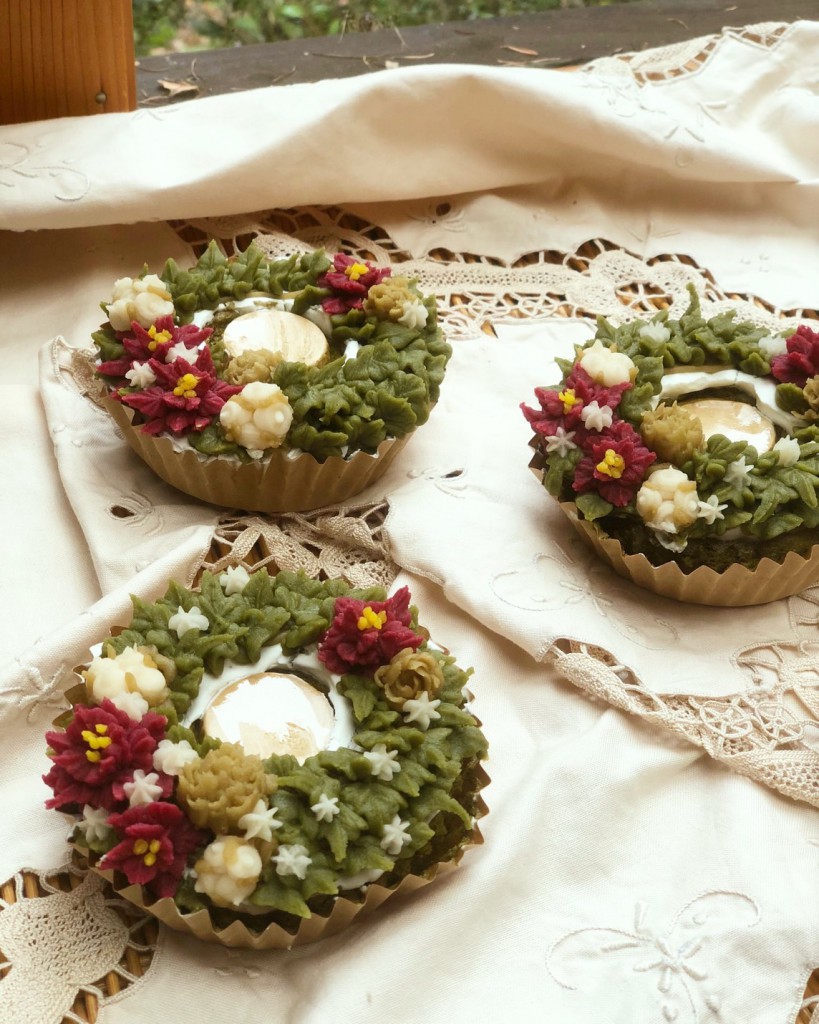 和なはアートフード協会認定校K U M M I’Sさんをお招きして、リース型の餡子アートを製作します。米粉や天然色素パウダーで身体に優しい素材を使ってポインセチアや星などを絞っていきます。リース型とカップケーキ型を作成し、その場でご試食頂けます。