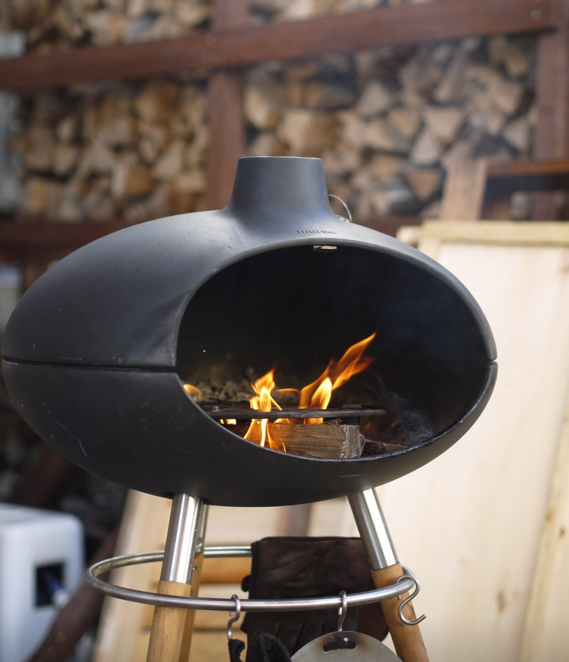 グリルフォーノは屋外の薪窯グリルで、暖をとるだけでなく、ピザ、スープ、スモークなど多様な調理を楽しむことができます(*ココットやピザパンなどオプション器具使用)。MORIASOBI店内にも展示されており、三本足のスタイリッシュな姿(鋳鉄部分のユニークな形がちょっとスライムを連想させますが・・)、テラスにあったら季節を問わず楽しめそうです。