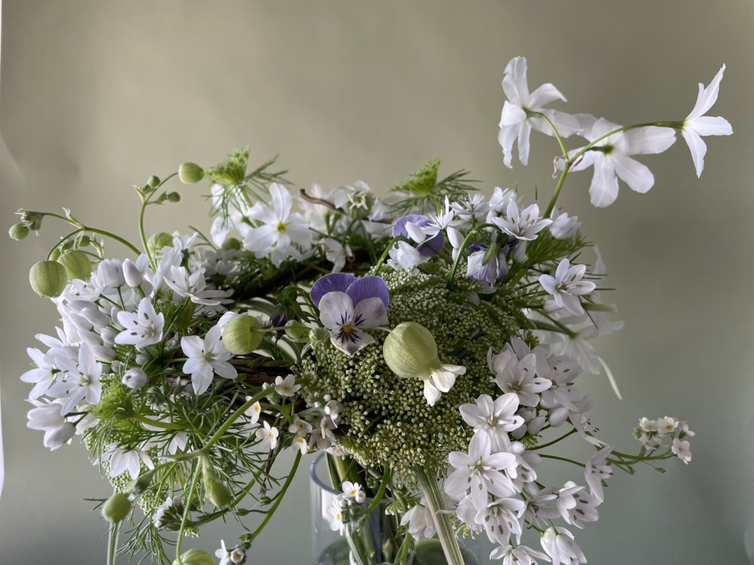 モリアソビカラー(グリーン)に、春らしい白や淡い紫の小花で、落ち着いた、優しい雰囲気のブーケ