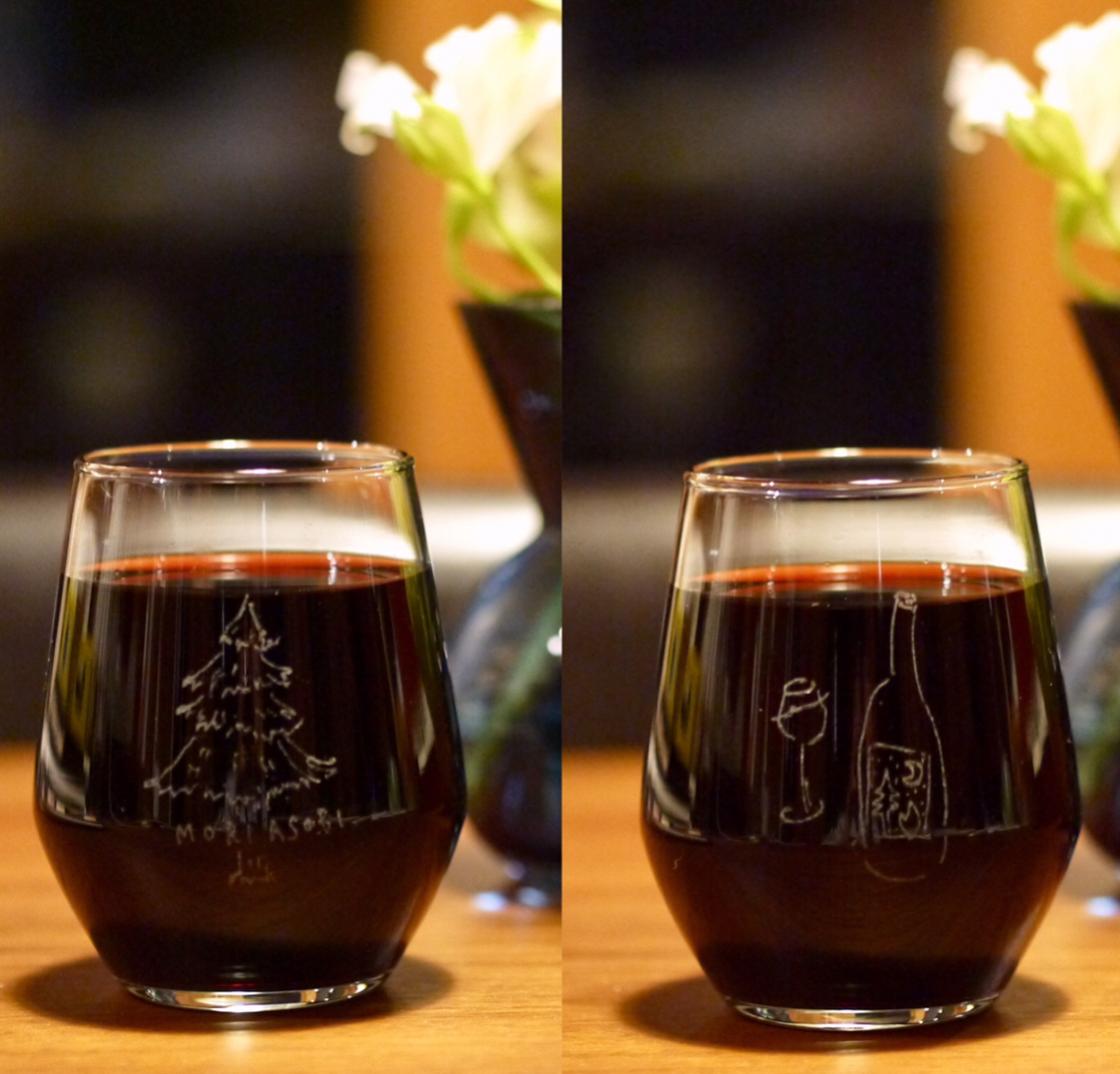 ワイングラス・カーヴィングで作ってもらったオリジナルカーヴィングのグラスを持ち帰りました。MORIASOBIの文字入りでなかなかいい感じです。