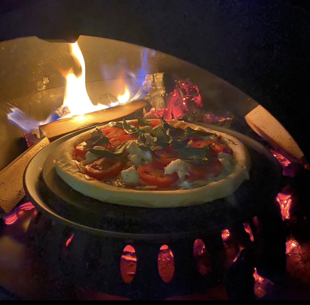 シンプルな焚き火でも、写真のように薪窯としてピザを焼いたり、チキンは塩胡椒でグリルしたり、専用ドアと煙突部分に蓋をすれば簡単に本格的な燻製も。