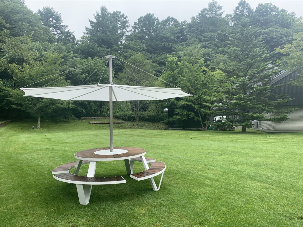 円盤のピクニックテーブル”Pantagruel” と大きなパラソル ”inumbra3500”