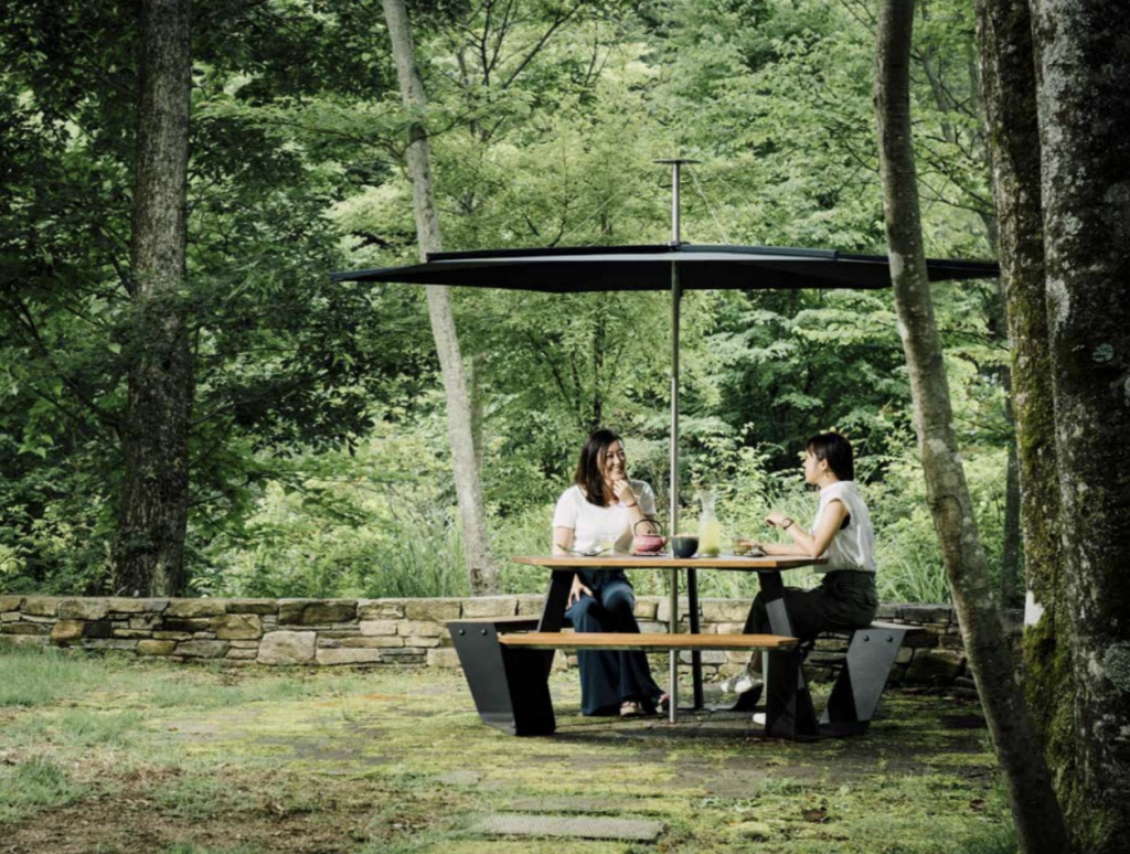 テーブルの天板は回転式になっていたり、パラソルは見上げた時に、傘の受骨がなく、開放的でとても美しいです。