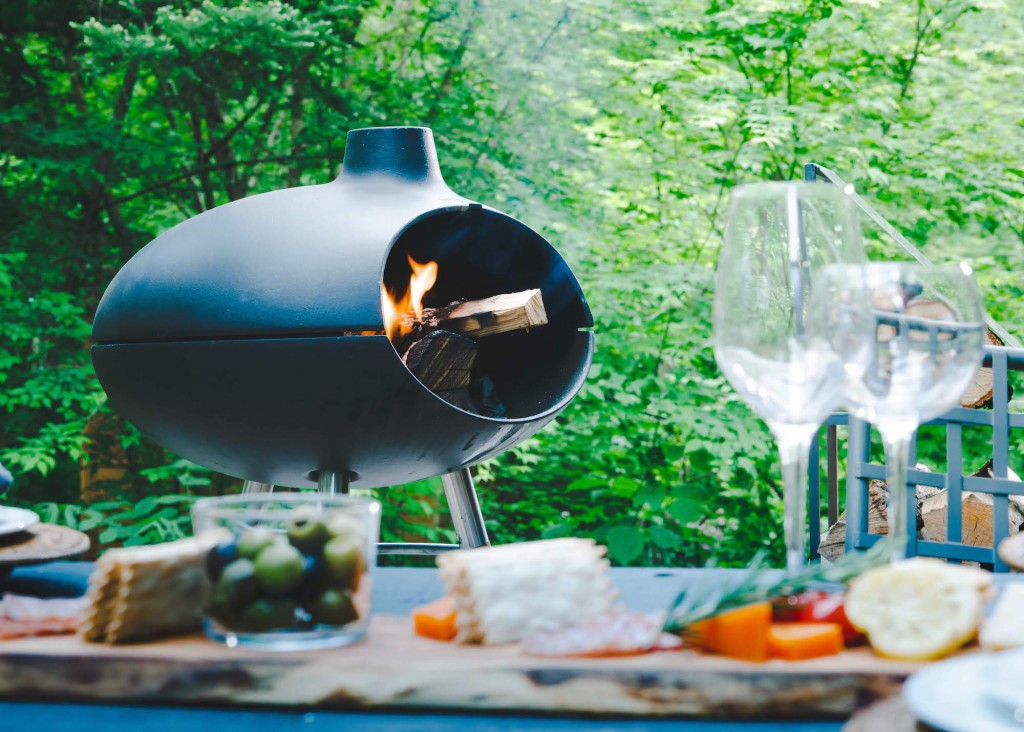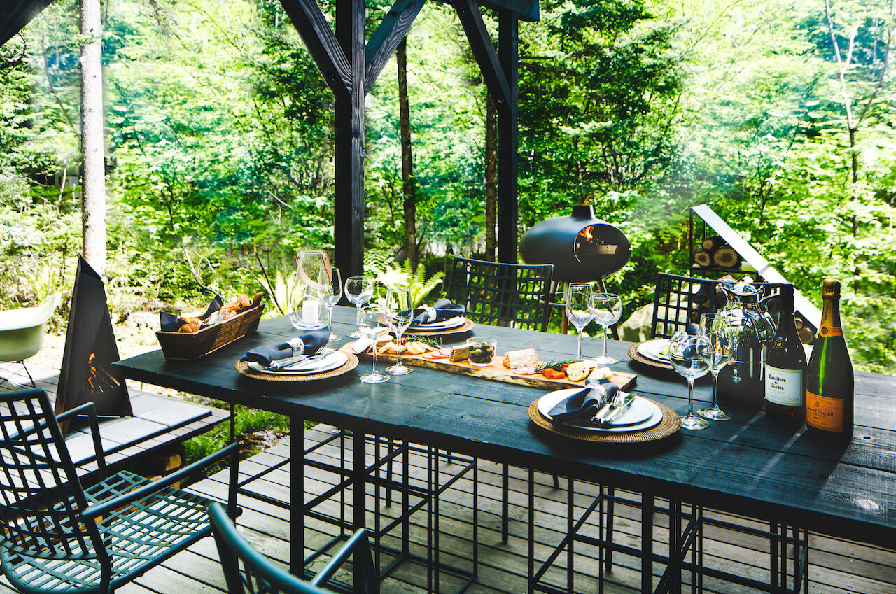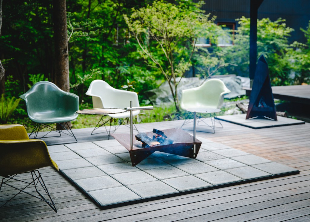 前庭としてデザインされたオープンデッキ。ステップフロアは空間に奥行を添え、建築を引き立てると共に、ダイニングエリア、ファイヤーピットエリアを緩やかに分けます。急な天候の崩れを気にせず、アウトドアダイニングを楽しめるよう、ダイニングエリアにはサンルームのように日の光がそそぐガラス屋根を設置しました。ファイヤーピットエリアは木々をデッキに残し、木立と空の高さを感じる開放的な空間となりました。