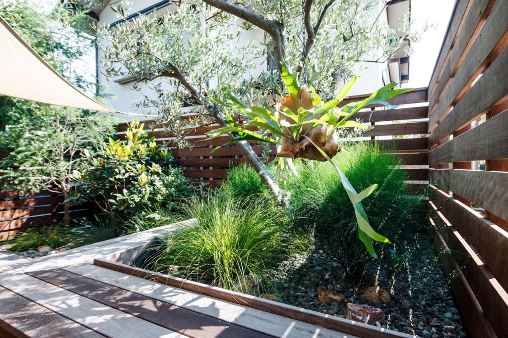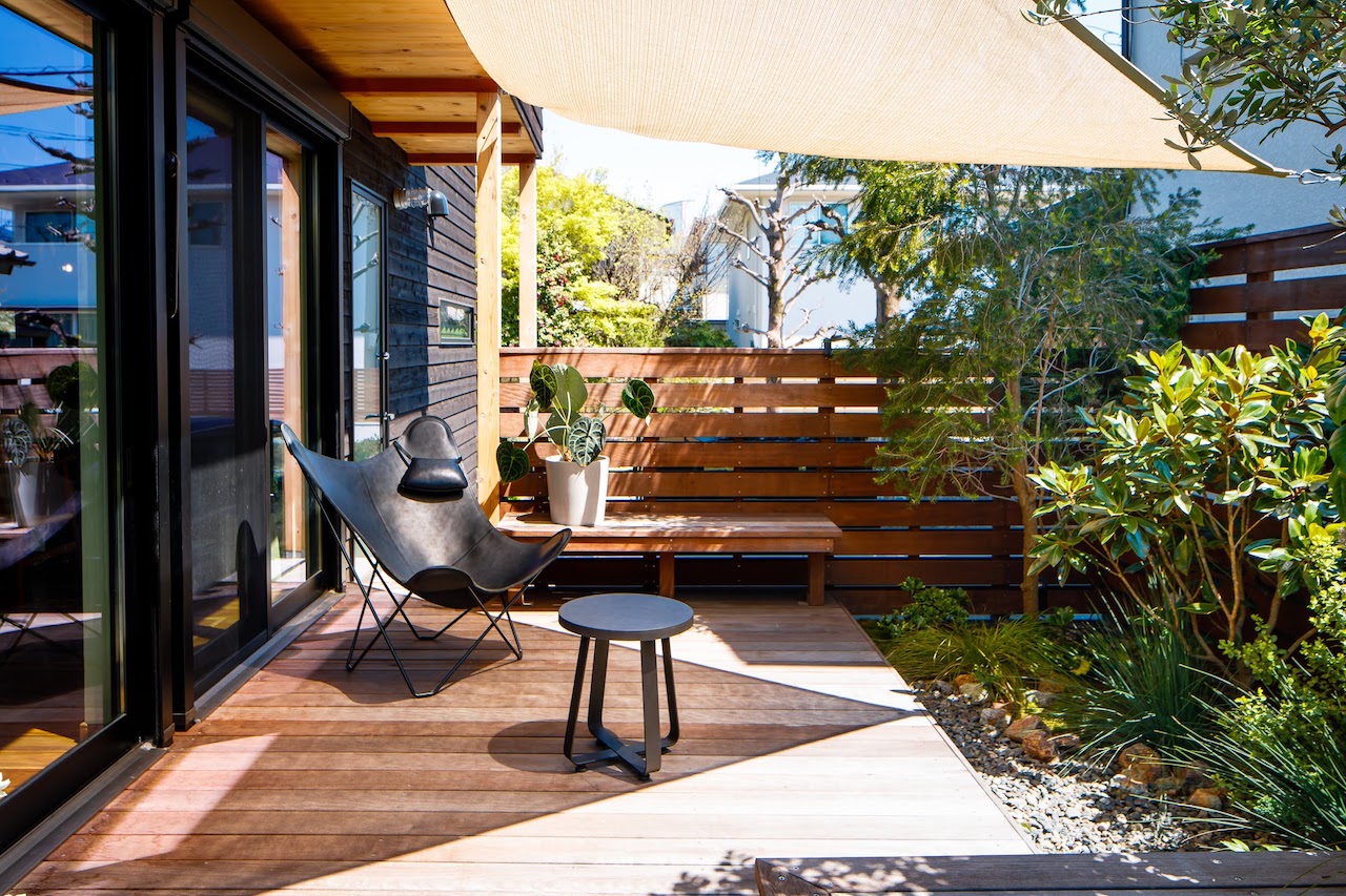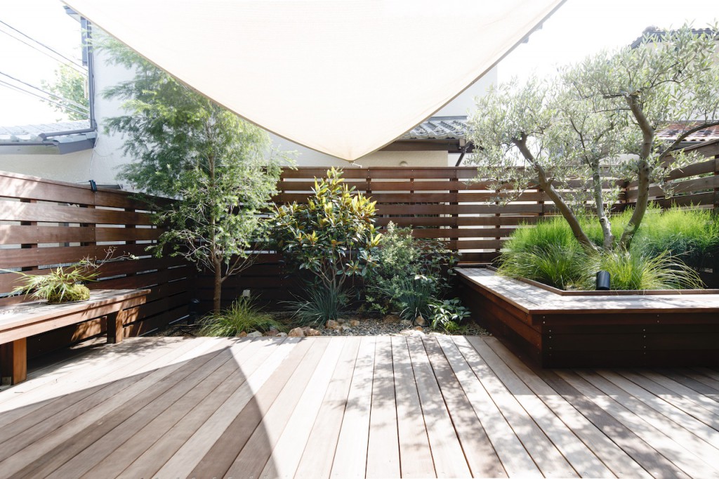 内から外へ繋がる広い奥行きを活かしたガーデンテラス。シンボルツリーや多様な植物を立体的に植栽し、優しく光をさえぎるタープで、ナチュラルなリゾート感のある雰囲気を演出しました。植物を取り囲むように設置した造作ベンチは、緑のそばでのくつろぐ時間を提案するとともに、デッキと同素材にすることで空間の統一感を高めました。植物を愛でながら、季節の移り変わりを楽しむ空間となっています。