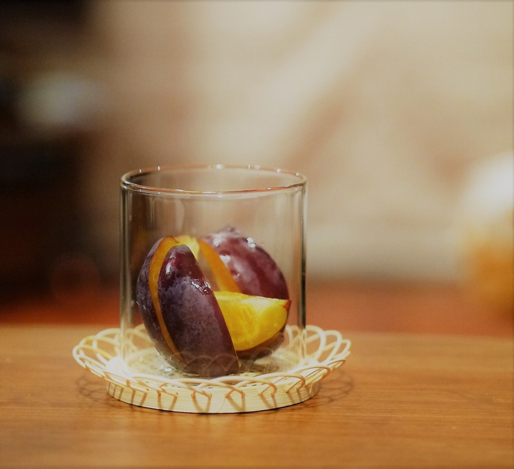 無色透明ガラスの素直でシンプルな質感は他のものとも相性がいいので、今朝はリッドを竹のコースターと重ねて小皿風に。何を合わせて何を入れるか考えるのも楽しくなります。