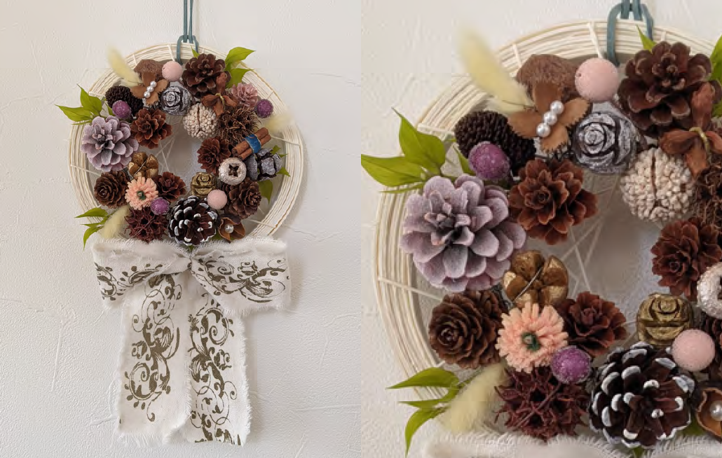 トロッケンクランツは、ドイツ語のtrocken (ドライ)、kranz (リース) を表した自然の恵みである木の実などを多く使う伝統的なクラフトです。