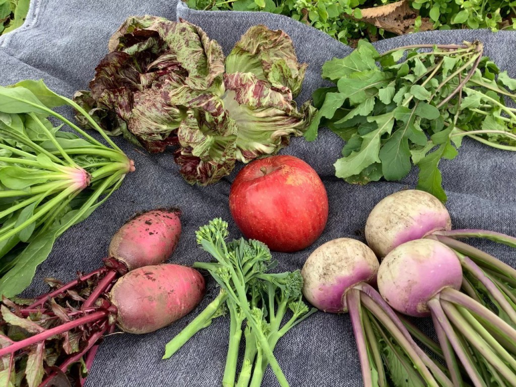 あやめ雪、紅くるり、原木しいたけ(大)、原木しいたけ(小)、玉ねぎ、葉付き大根、聖護院かぶ、ズッキーニ、ラディッシュ