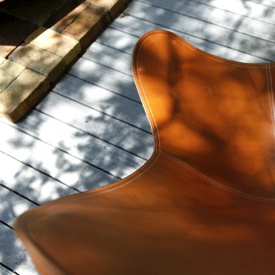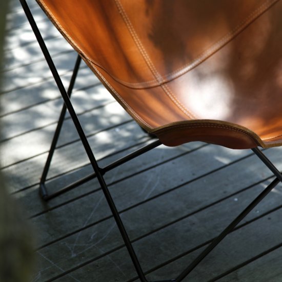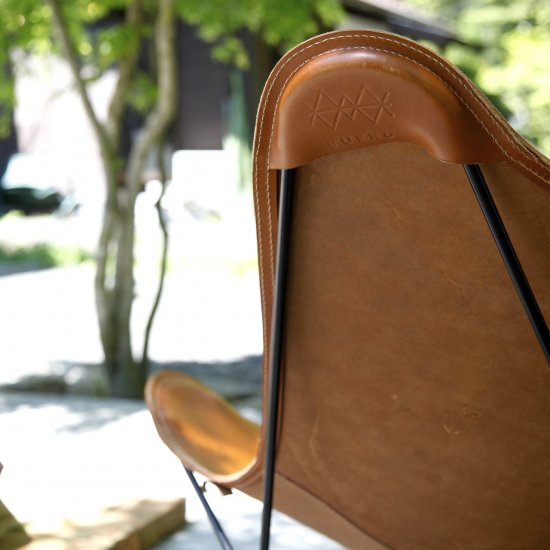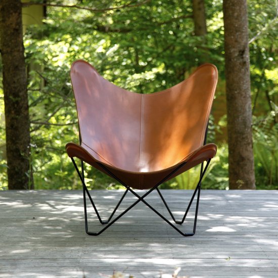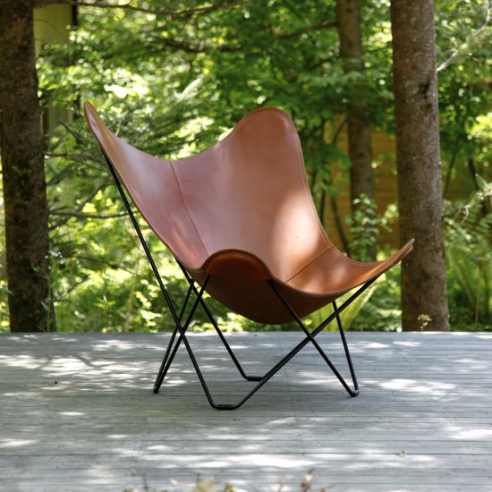 スェーデン『CUERO社』のBKFチェアは3人のアルゼンチンのデザイナーによって作られ、デザイナーそれぞれの頭文字をとって名付けられました。蝶が羽を広げた形に似ていることから、“バタフライチェア”という愛称があり、その名のように1脚で圧倒的な存在感を放ちます。