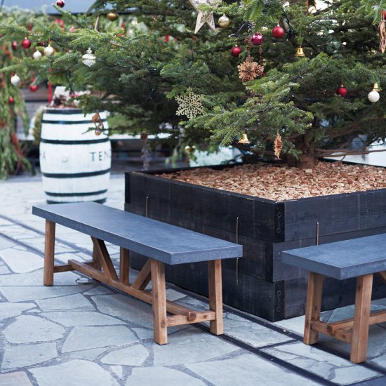 天板・座面には、軽量で強靱なファイバー強化セメントボードを使用。セメントボードは錆びないので屋外使用にも適しています。内部には補強としてスチールのフレーム、木製桟木とスチレンボードが入っており、その強度はヨーロッパの第三者検査・認証機関” ビューロベリタス”によるアウトドア家具としての荷重、衝撃等の安全基準に合格しています。脚部分に使われれいるアカシア材も、硬質で腐食や耐久性に優れておりアウトドア家具に適したウッドです。