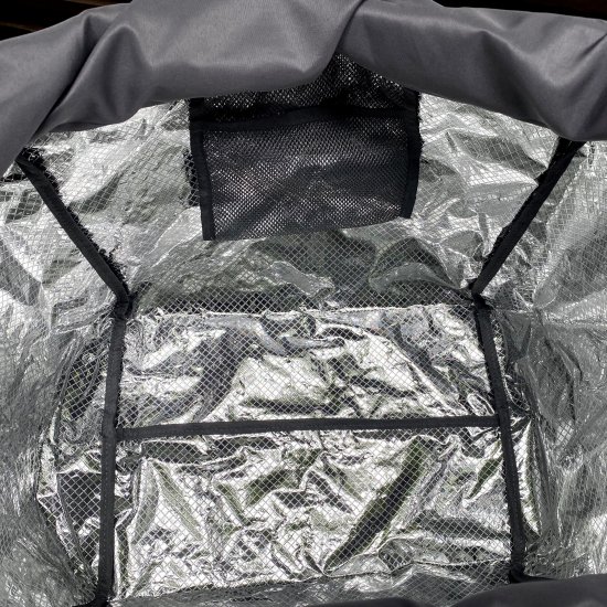 内部には保冷シートを貼り付け、内側には保冷剤用のポケットもつけています。