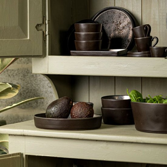 内側のほんのりメタリックな質感と手で作ったような少しいびつな形が金属の打ち出し加工のようにやわらかく自然に光を反射し、外側のこっくりしたチョコレート色とあわさって、なんともいえない温かみがあります。