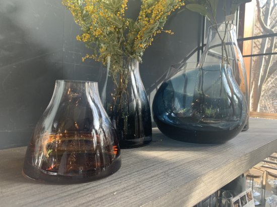 Roのフラワーベースは、下部に行くにつれ段々と色がついていき、花瓶の中の水を見えにくくすると共に、茎がガラスの色に徐々に溶け込んでいくように見えるデザインになっており、「自然」と「作品」が美しく機能的に溶け込んでいるような Ro本来のこだわりを表現しています。