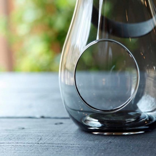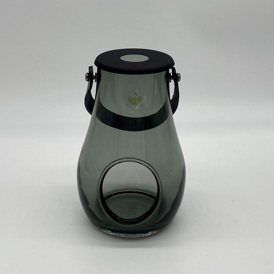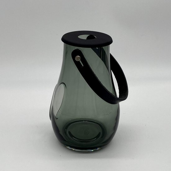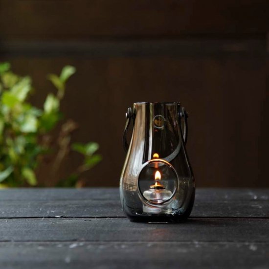 Design with Lightはボトルのような形のランタンホルダー。ナチュラルレザー(牛革)のストラップ(取っ手)は、持ち運びもできて取り外しも可能。機能性のみならず美しいガラスに革の暖かみを添えることでよりスタイリッシュなデザインに。